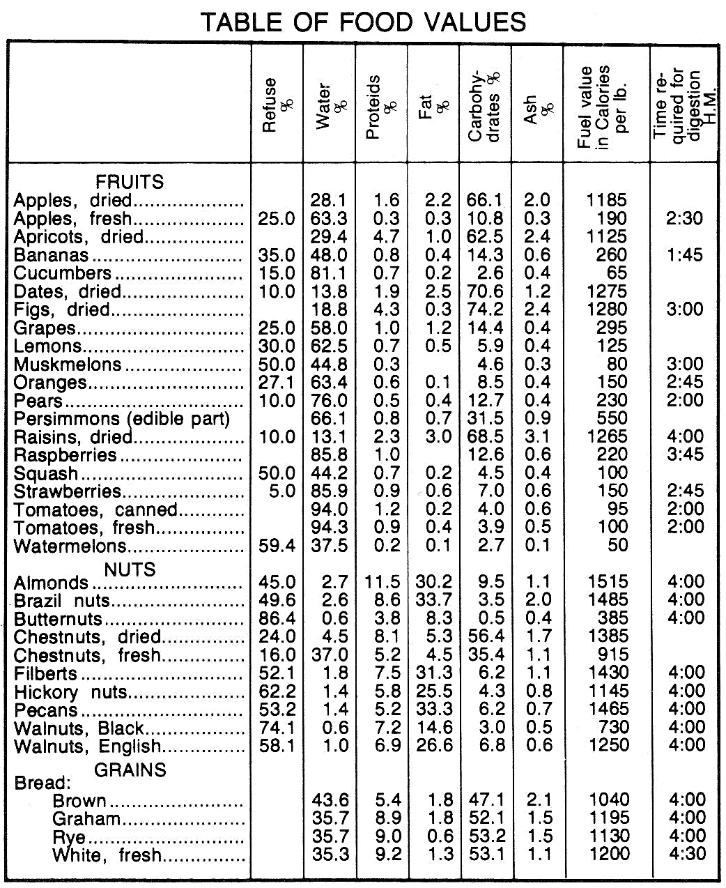 Fresh fruit contains water of the purest and best kind, capable of permeating the system in a marvelous manner. Grape juice is a particularly wonderful solvent. It thins and stimulates the blood, opening the way into capillaries already dried and choked up — if the process has not gone too far. By a course of unfermented grape-juice treatment, people with sunken eyes, wrinkled skins and poor complexions become plump, ruddy and lively. The increased permeability enables the spirit to manifest more freely and with renewed energy. The following table, which with the exception of the last column, is taken from the publications of the United States Department of Agriculture, will give the aspirant some idea of the amount it is necessary to eat for different degrees of activity, also the constituents of the various foods named.