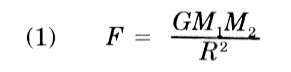 — where "G" is a constant, "M1" is the mass of object one, "M2" is the mass of object two, "R" is the distance between the centers of the objects, and "F" is the force of either object on the other. Equation (1) is called Newton's Law of Gravitation.
