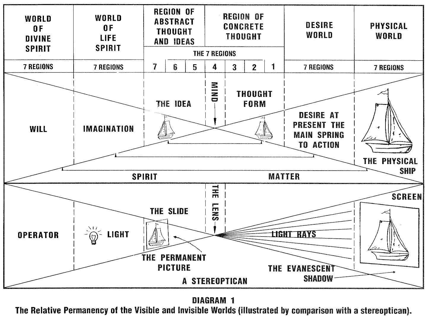 As the name implies, this region is the home of the archetypal forces which direct the activity of the archetypes in the Region of Concrete Thought. From this Region, Spirit works on matter in a formative manner. Diagram 1 shows the idea in a schematic way, the forms in the lower World being reflections of the Spirit in the higher Worlds. The fifth Region, which is the one nearest to the focusing point on the Spirit side, reflects itself in the third Region, which is nearest the focusing point of the From side. The sixth Region reflects itself in the second and the seventh reflects itself in the first.