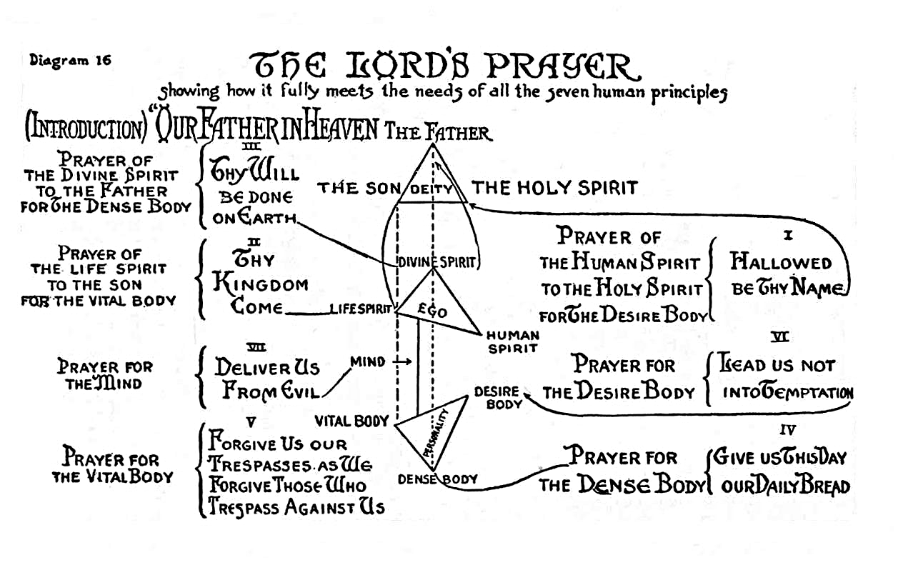 In the Lord's Prayer there are seven prayers; or, rather, there are three sets of two prayers and one single supplication. Each of the three sets has reference to the needs of one of the aspects of the threefold Spirit and its counterpart in the threefold body. The opening sentence, Our Father Who art in Heaven, is merely as the address upon an envelope. The student is referred to Diagram 16 on page 465 of The Rosicrucian Cosmo-Conception for a key to this prayer, showing diagrammatically the relation between the Trinity, the threefold Spirit, the threefold body and the Mind, each aspect of the Spirit being connected by a line with the prayer specifically suited to its counterpart in the threefold body and addressed to its guardian aspect in the Trinity.