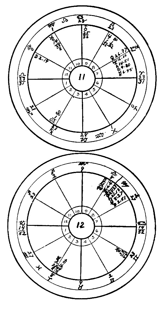 People not congenitally affected, who have cardinal signs rising, particularly if cardinal or fixed signs also invest the Midheaven and Nadir, rarely become insane. The active nature forbids morbid tendencies and blues, disappointment is quickly thrown off and hope springs eternal in the cardinal breast urging to renewed struggle with conditions. It is said that the exception proves the rule, and when Capricorn rises the saturnine rulership gives a tendency to melancholy which under certain aggravating circumstances may provoke suicide, particularly when the ruler is cooped up in the Eighth House, as we see in horoscope No. 12. Virgo, a common sign, devoid of stamina, holds the Sun, Saturn, Venus, and the Moon in this, the house of death; this robs the person of joy in life and impels him to end it under stress of sorrow. Knowledge on the part of an astrologer friend has so far forestalled the calamity, and it is hoped, may save the poor man from committing so grave a crime.