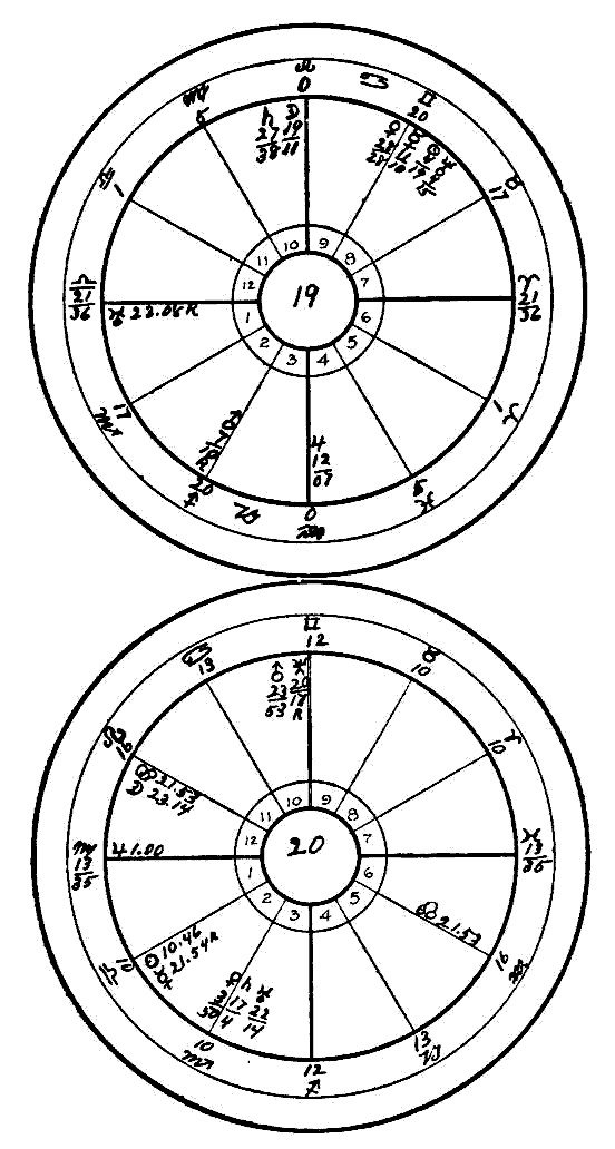 The before-mentioned aspects were from Cardinal and Fixed signs, which indicate that which is almost unalterable destiny. But Neptune near the Ascendant, in a Common sign, Gemini, points to a condition in the making. He is trine to Saturn, the afflicter of the mind, and supported by the dynamic energy of Mars.