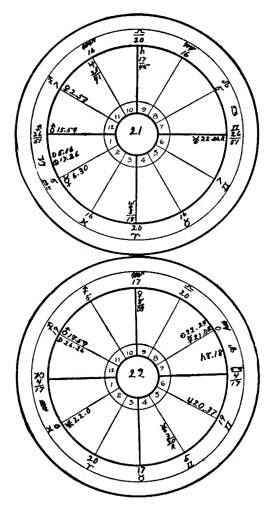 In order to further aid the student of the stellar science we present a number of horoscopes of people who have come to us for help in their trouble. We therefore know these cases to be authentic and trust that our delineation of their various ailments by means of astro-diagnosis may prove a true guide.