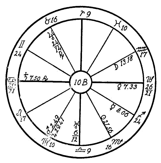In 1914 we find the progressed Sun in the first degree of Scorpio, and the progressed Moon in the sign Aquarius forming an opposition to the Ascendant and the radical Jupiter in Leo. It is also coming up to a square of the radical Saturn, Mercury, and Uranus in Scorpio. In this same year two new Moons afflicted the three latter planets. The one on January 26th fell in five degrees of Aquarius in opposition to Jupiter and square to Saturn and Mercury. On April 25th the new Moon fell in four degrees of Taurus, square to Jupiter and opposition Saturn and Mercury. This was the time when —