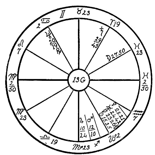 We will here examine the sympathetic aspects of planets in the cardinal signs. We find in this horoscope a most interesting lesson illustrating the sympathy and antipathy of the planets when placed in signs which are square or in opposition to each other. The horoscope of this young man has the common sign of Gemini on the Ascendant, with Mercury, Venus, Neptune, the Sun, Mars, and the Dragon's Head all in Cancer, the sign which has rule over the stomach. Four of these planets, namely, Mercury, Venus, Neptune, and the Sun are in opposition to Uranus and square to Saturn. The Sun is parallel to Uranus and Neptune; Neptune, Uranus, and the Sun are square to the Moon in Libra in the 6th house.