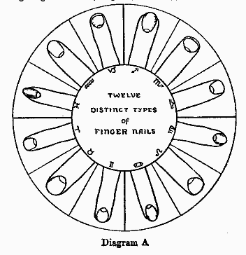 Diagram A will give the reader a key to the pure types of finger nails, correlated to the signs of the zodiac. Horoscopes with many planets in one sign will change the nails. In the time the student will be able by using —