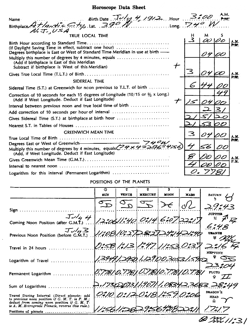 1. When you have studied this Astrology Independent Study Module, please set up the practice horoscope below (Birth Place: Stockton, CA, USA; Lat.: 38 deg. N.; Long.: 121 deg. W.; Birth Date: January 22, 1912; Birth Time: 0:50 A.M.). (Optional)