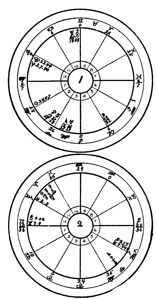 In this connection we present first figure No. 1, which is that of a boy, in 1912 about 16 years of age. The Fourth and Tenth Houses, the planets in them and their rulers show the parents. the parent who most influences the life is shown by the Tenth House configurations, and the Fourth House indicates the one lease concerned in the child's destiny.