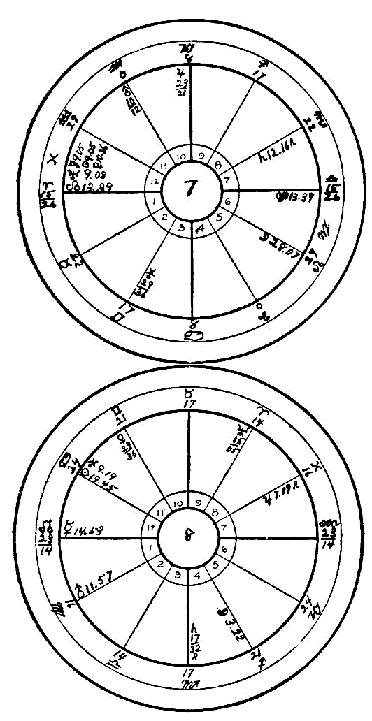 Horoscope No. 7 has both Venus and Mercury combust in the Twelfth House; we may therefore conclude that there is a lack of nerve force or vital fluid, and that the venous circulation of the ear is obstructed. Thus congestion is inevitable, and the hearing becomes less and less acute. Osteopathy is excellently equipped to deal successfully with a case like this; were the configuration in a fixed sign we might not feel optimistic, but flexibility is the salient characteristic of the common signs, so we see no reason why with patience and perseverance a cure may not be consummated.