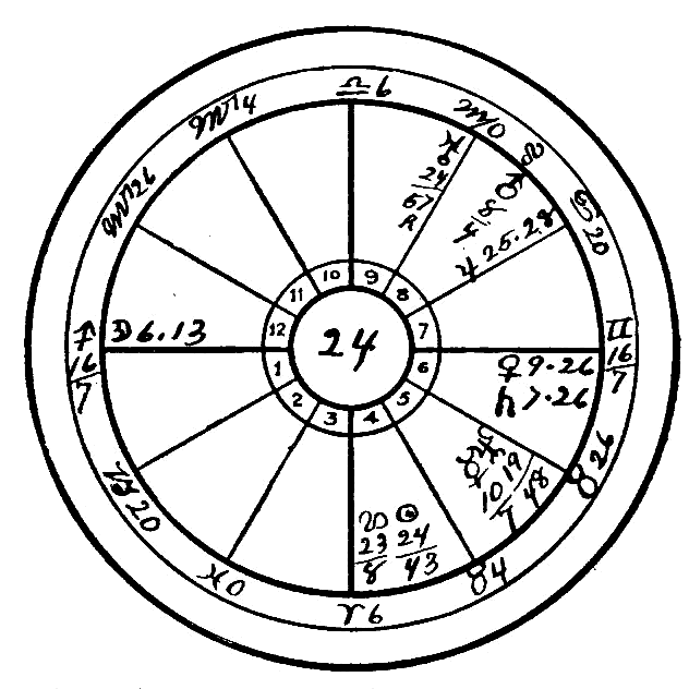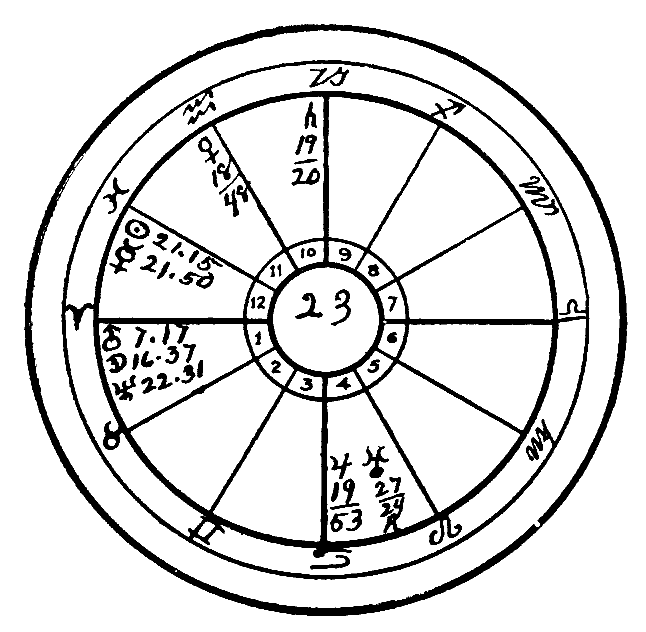 You will notice that Saturn, the planet of crystallization and obstruction, is placed in Gemini, the sign which rules the lungs, and although Saturn is the highest elevated planet in the horoscope, besides being unafflicted there is always a weak spot in the anatomy where he is found. The hot, inflammatory and disruptive Mars is in Leo, the sign which governs the heart, square to the Sun, which is ruler of Leo, in the sign Taurus, which governs the throat and all the passages there. This is a configuration which usually produces fevers, inflammation, wounds and hemorrhages. Thus there was a tendency in the system toward tuberculosis, and you will furthermore notice that there are four Common, flexible signs on the angles, the Sixth House sign, Virgo, being on the Ascendant with the spasmodic Uranus afflicting Venus, the ruler of the venous circulation, which is placed in Gemini, the sign ruling the lungs. Uranus gives a tendency to coughs and spasms, so you see that the condition is very well outlined in the horoscope. The four common signs show that when he became subject to illness the Virgo nature was too weak to throw it off and he simply made up his mind that he was going to die from it, hence there was no help. If he had been able to throw off the feeling of impending death and to struggle against the sickness there is no doubt that with this horoscope he could have overcome.