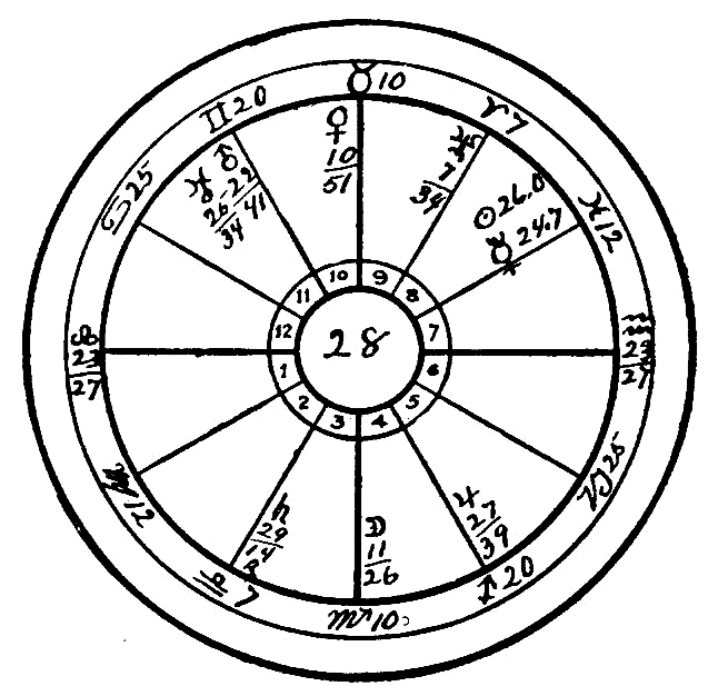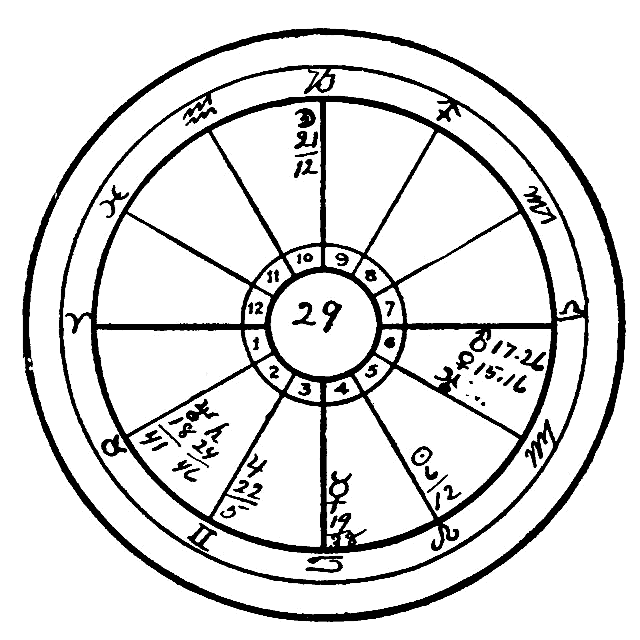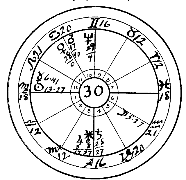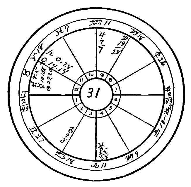 Were it not for good aspects which we have not hitherto mentioned, namely, the sextile of Saturn to Mercury and its trine to the Moon, this person would certainly have become an inmate of an insane asylum, but this is one of the few cases where Saturn really helps in a material sense, for even his good aspects will obstruct when coming to the other planets; but when this obstruction is applied to the Moon, the flightiest planet of all, and to Mercury, the one next to her in swiftness and instability, both of then significators of the mind, Saturn does really help to hold the flighty mind in check, and such a weak mental condition as the one found here will be vastly benefited by these aspects, whereas if there are no evil aspects the sextile of Mercury and Saturn will strengthen the mind in a wonderful degree.