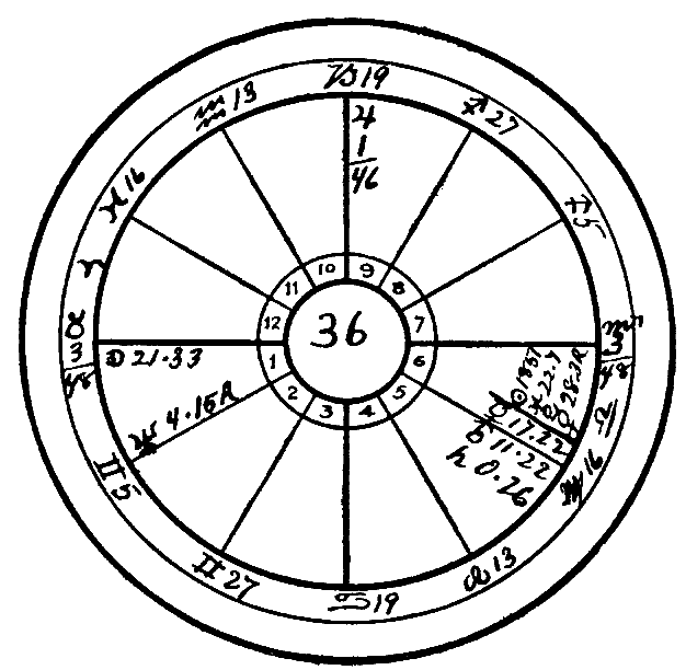 In 1913 the Sun progressed to the conjunction of Uranus and Mars. The aspects of the Sun are always effective for three years, one and one-half years before the aspect is exact, and a like period after. Therefore it was still active in 1914, when the Moon progressed to the conjunction of Saturn and thus enlivened this square to the Sun, Moon and Venus. Neptune, the watery planet, also reached the natal Sun by transit, and the poor soul was released by the total obstruction of the liquids; in other words, the dropsical condition stopped the heart.