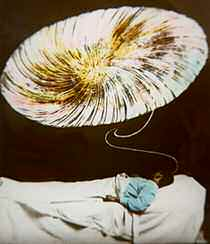 The aura of one of the egos looked like a small oval that was a beautiful shining blue. It was moving away up in the air. After a few seconds it disappeared from her sight. Then she saw something about the same size that was a bright red with a black rim around it. After awhile the red part grew smaller and the object was entirely black. Then it, too, disappeared.