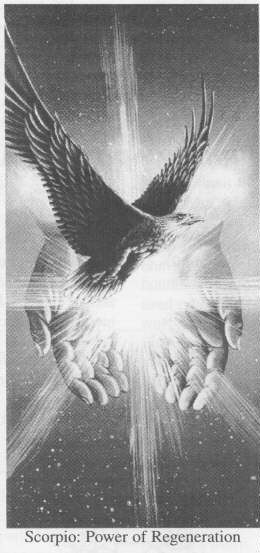 Scorpio is the only sign composed of three symbols, indicative of the tests that embrace the threefold personality. Mental, emotional and physical levels are all involved. The Scorpion is the symbol for the lowest manifestation of this sign. Like the martyr, it may as likely inflict death on itself as use its venom on another. A second symbol for Scorpio is the Eagle, symbol of the bird that can fly closer to the Sun (Spirit) than any other. The third symbol is the Phoenix, the mythical bird capable of resurrecting itself from the ashes of its former body. Wherever Scorpio is found in the birthchart is where transfiguration and resurrection must take place.