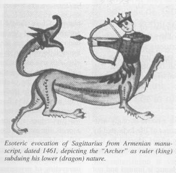 The Sagittarian is represented by the immortal Centaur. Individuals born under its rays are endowed with the higher mental and creative attributes as well as the physical power, embodied in the horse, to project and establish their ideas. The arrow glyph illustrates that while Sagittarians often aim their sights on divine targets, their high aspirations may be destabilized by a misdirected enthusiasm, boisterous animal spirits, resulting in an active battle between constructive and destructive forces. On the physical plane Sagittarius rules the haunches, loins, thighs, and the upper legs.