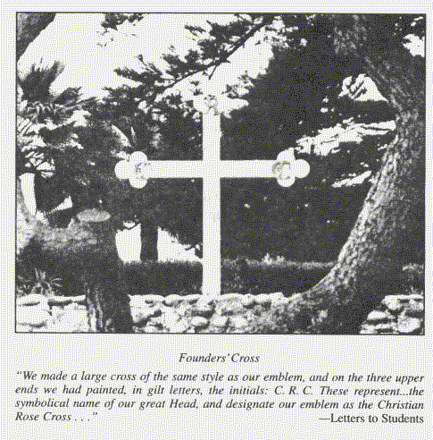 Then the composite emblem of the Mystery School was planted: The cross representing matter, whose arms and upper limb bore the golden letters C. R. C., and the climbing red rose, representing the verdant evolving life climbing to greater and greater heights by this crucifixion. The black cross (later changed to white to avoid unfortunate associations), the twining green stem of the plant, the thorns, the blood red roses — in these is hidden the solution of the World Mystery.