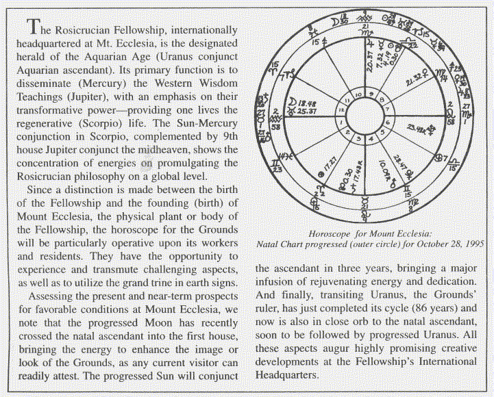 Why at this precise time? Because the planetary configuration was most propitious for initiating and sustaining the work of this spiritual center. It is instructive to note that both Fellowship and Grounds horoscopes show Jupiter as the most elevated planet, and in both the sun and mercury are in conjunction — in 8th house (regeneration) Leo for the former and in 9th house Scorpio (regeneration) in the latter.