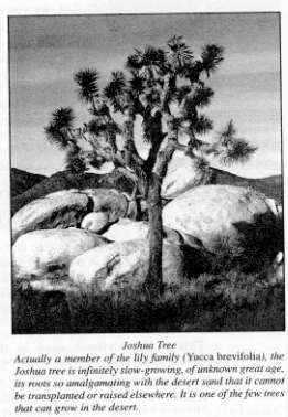 It was a real experience to rise early and walk into the brooding silence which seemed to envelop everything. It was also interesting to examine the plant life and to note their various methods of survival in those arid conditions. The cacti with their thorns were very forbidding, but another plant which had large hairy leaves, very rough to the touch, held my interest. These, my friend informed me, were called Joshua Trees and after breakfast she would drive me to see a whole forest of these in a nearby valley.