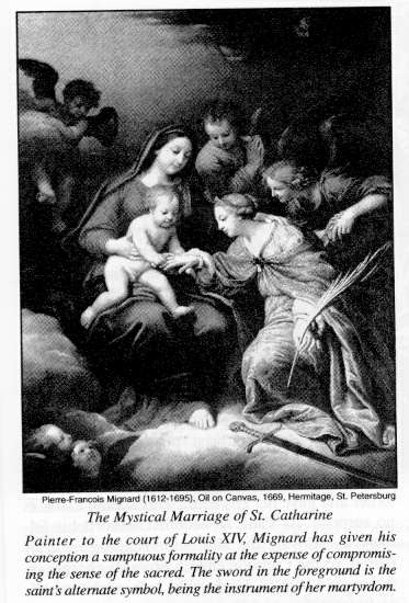 In the Christian tradition, an idea that has served as a particularly fertile subject for the artistic imagination is the mystic marriage, which, over time, became stylized as a depiction of the bride of Christ, named Catharine, meaning "the pure one," proffering her hand to be ringed by the infant Christ (Jesus) Child. Such a popular representation conveyed more esoteric truth and profundity than most artists or viewers consciously realized.