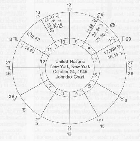 Ten weeks after history's bloodiest war ended, the official inception of the U.N. occurred in New York City. Since the Moon of activity is in the second decan of its sign, this organization was not entirely new on October 24, 1945. America's Aquarian President, Franklin Delano Roosevelt, had pushed for it in 1941. Shortly before his death in 1945, Aquarian Wendell Willkie had published the book that greatly influenced the U.N., One World. The U.S. embraced the concept.[1]