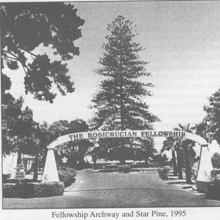Planted in Mt. Ecclesia's early days, as near as we can gather around 1915, photographs indicate that from the outset the tree seemed "a natural" for bearing Christmas lights. In grand view, it stands forty yards inside the Fellowship archway, each of whose two piers is flanked by a regal sejant lion — a fitting tribute to the Fellowship's founder, who was a triple Leo! The tree rises to a height of one hundred and twenty feet.
