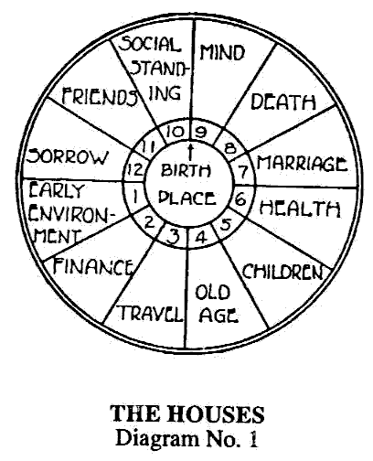 The purpose of the division into signs and houses is to determine the angle of the stellar ray, for upon that depends its influence. In order that you may still better understand the principle, drive one of the needles of your wheel into a block of wood so that it stands upright; place it in front of you, and compare it with the illustration in this Independent Study Module which is marked "The Houses." (Diagram No. 1).