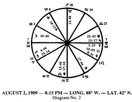 A count of the twelve houses on the map we have made shows that all the twelve signs are present and our horoscope is therefore complete so far as the signs and house are concerned, but it remains to calculate the places of the planets and enter them in their respective houses before the map is complete. This instruction we will reserve for another Independent Study Module, however, and show by another example how the signs are placed on the houses.