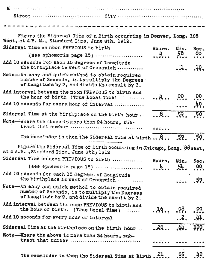 As we have now learned to find the sidereal time at birth for any place on our planet, we will proceed to cast the horoscope of an imaginary child born in New York City, N. Y., July 23, 1912, at 6:00 A.M., True Local Time. We figured the sidereal time of this birth to be 2 hours, 2 minutes, and 49 seconds. Now you need a Tables of Houses. (See our Simplified Scientific Table of Houses, which covers Latitudes from 0 to 66 degrees). Students who live in the Southern Hemisphere are particularly grateful for these tables for they are the only ones we know of that permit casting a horoscope for south latitude by the same easy process as when the birthplace is in the Northern Hemisphere. In addition there is a first section, a 50 page atlas, listing the principal cities and towns in the world including all county seats in the United States with their longitude and latitude rounded to the nearest exact degree (no minutes) as well as their adjusted time difference to the Greenwich Meridian. This saves the trouble of looking up the longitude and latitude of the birthplace in an atlas.