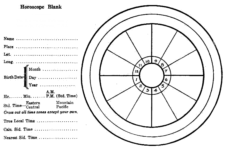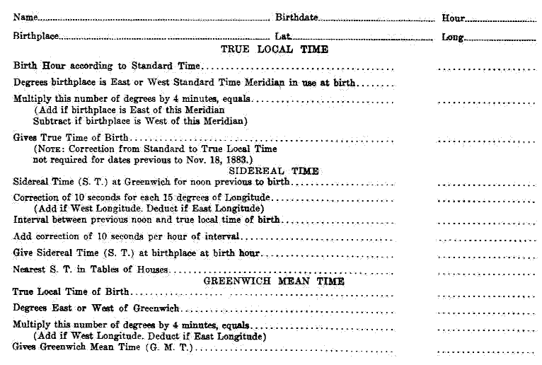 3. Below you will find a horoscope blank. Please figure the signs and degrees for a birth, New City, N.Y., September 15, 1912, at 2:00 A.M., Standard Time, giving all calculations. (optional)