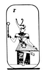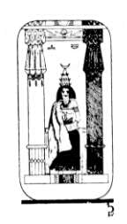 The Third Arcanum is termed the Isis-Urania. Here we see again the beautiful figure of the High Priestess. This time, however, her feet are resting upon the moon. Her body is radiant with the golden nimbus of the sun, and her head is crowned with the glory of twelve stars. She is seated upon a cubic stone which is covered with eyes, and upon which is also inscribed the picture of a cat, the animal that sees both in light and in the dark — the whole a composite symbol of clairvoyance. The Urania holds a scepter which points heavenward. Upon the other hand rests an eagle which represents the power of the New Age. This card is also termed the Venus-Uranis, or Celestial Aphrodite, as shown by the emblem of the planet in the upper left comer.