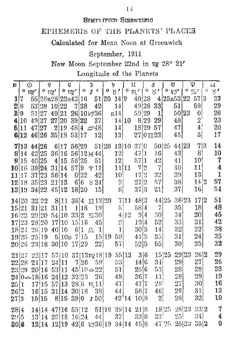 September, 1911 - Longitude of the Planets