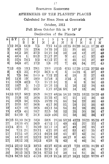 October, 1911 - Longitude of the Planets