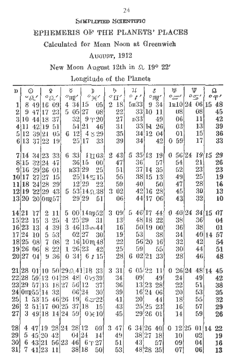 August, 1912 - Longitude of the Planets