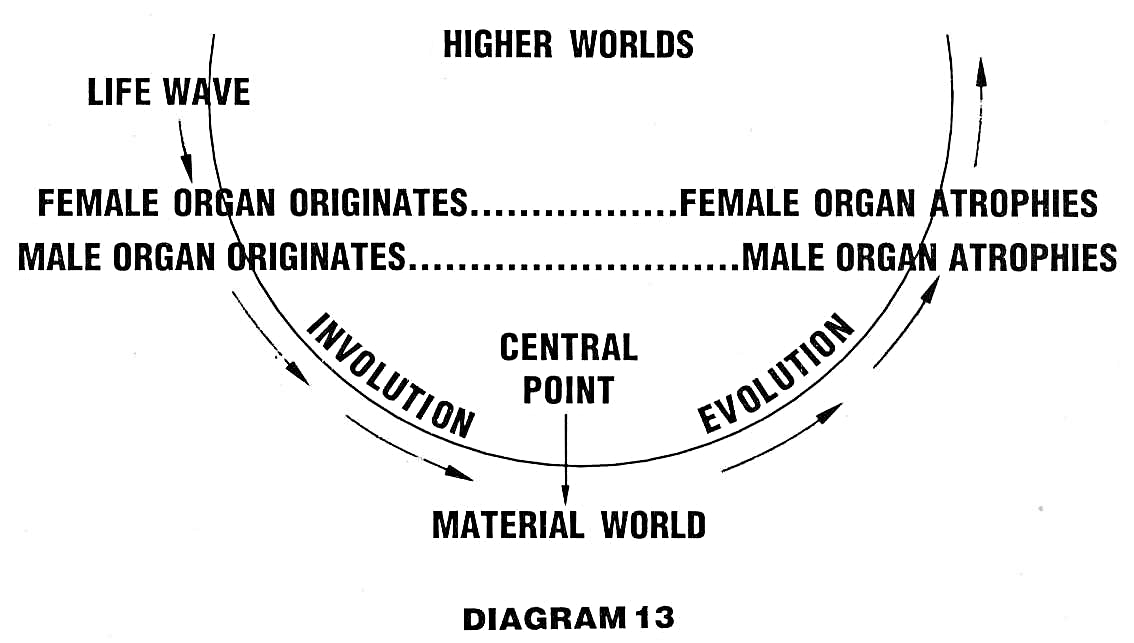 All that was manifested during the descending period of involution remains until the corresponding point on the ascending arc of evolution has been reached. The present generative organs will degenerate and atrophy. The female organ was the first to come into existence as a separate unit and, according to the law that "the first shall be last," will be the last to atrophy. The male organ was differentiated last and is even now commencing to divide itself from the body. Diagram 13 will make this clear.