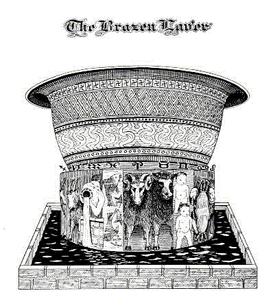 The Brazen Laver was a large basin which was always kept full of water. It is said in the Bible that it was carried on the backs of twelve oxen, also made of brass, and we are told that their hind parts were toward the center of the vessel. It appears from the Memory of Nature, however, that those animals were not oxen but symbolical representations of the twelve signs of the zodiac. Humanity was at that time divided into twelve groups, one group for each zodiacal sign. Each symbolic animal attracted a particular ray, and as the holy water used today in Catholic churches is magnetized by the priest during the ceremony of consecration, so also the water in this Laver was magnetized by the divine Hierarchies who guided humanity.