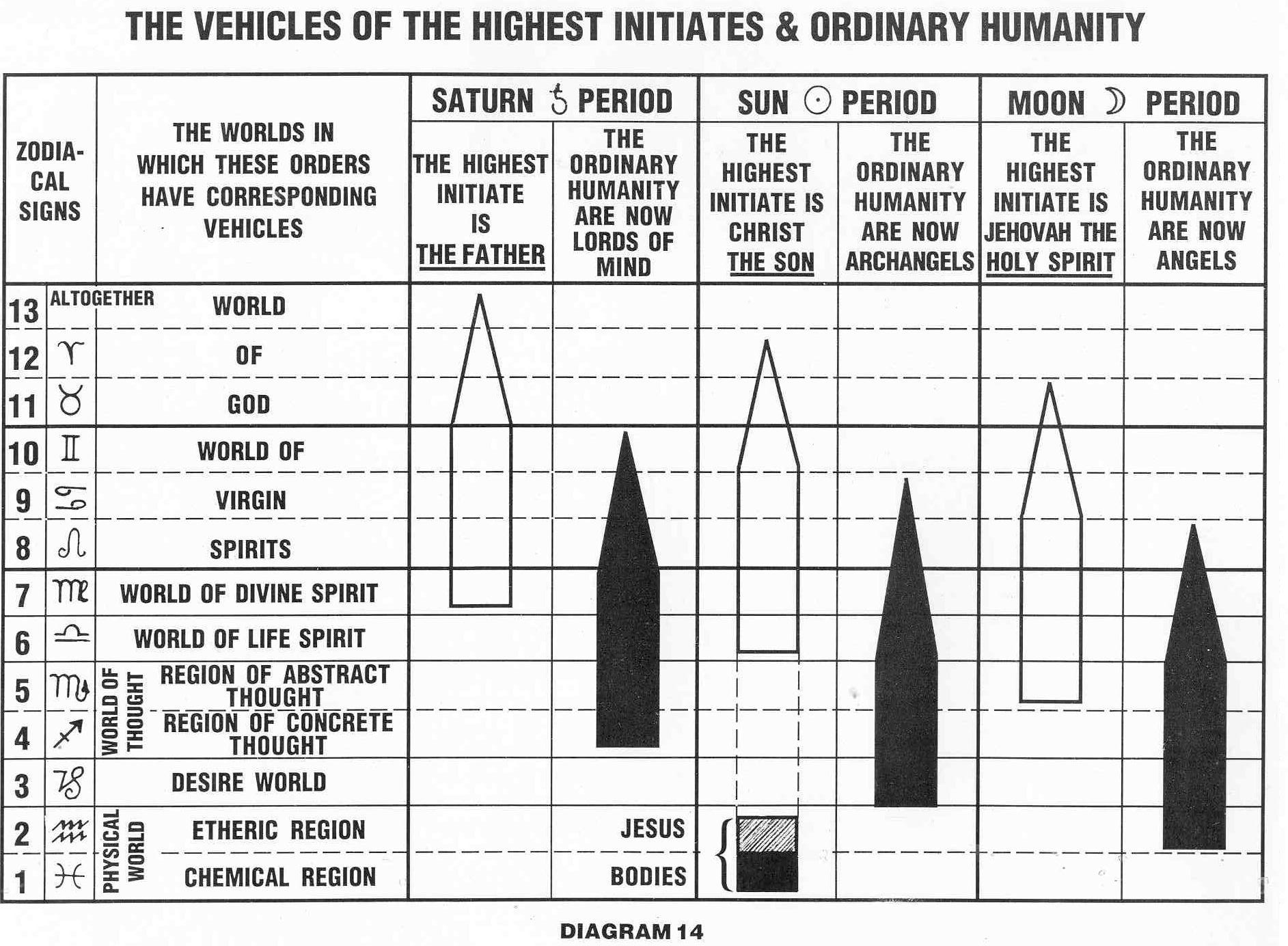By looking at Diagram 14 we shall see that this tallies with what we have learned in previous lectures. Each Being has seven vehicles, and the lowest of Jehovah's vehicles comes down to the Region of Abstract Thought, where we have our Ego. There we are below the line that divides spirit from matter, there is differentiation. We have seen in Lecture No. 3 that every planet in our system has its three separate worlds, the Physical World, the Desire World, and the World of Thought — that is, separate vehicles for each planet — but the unifying principle in our solar system is the Life Spirit, and therefore the Son, who is to be the unifying principle in the world, or in the planet, must have that Life Spirit evolved. Christ, the Highest Initiate of the Sun Period, at the present time ordinarily uses as His lowest vehicle the Life Spirit.