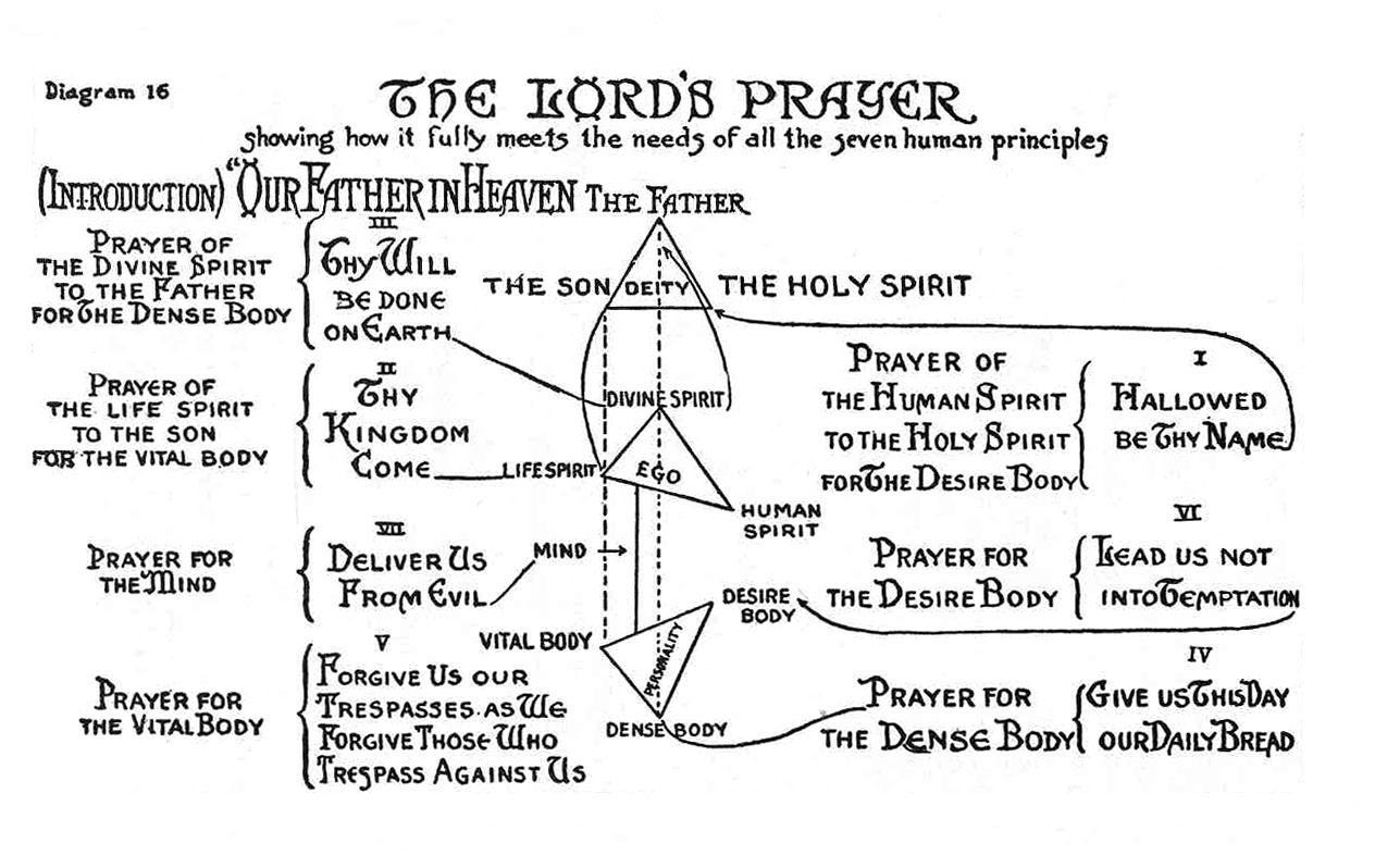 The vital body being the storehouse of the panorama of our life, our own sins and the wrong we have suffered at the hands of others are there inscribed, hence the fifth prayer, "Forgive us our trespasses as we forgive those who trespass against us," enunciated the needs of the vital body, and be it noted that this prayer teaches the doctrine of the remission of sins, in the words, forgive us, and the Law of Consequence in the words, as we forgive, making our attitude to others the measure of our emancipation.