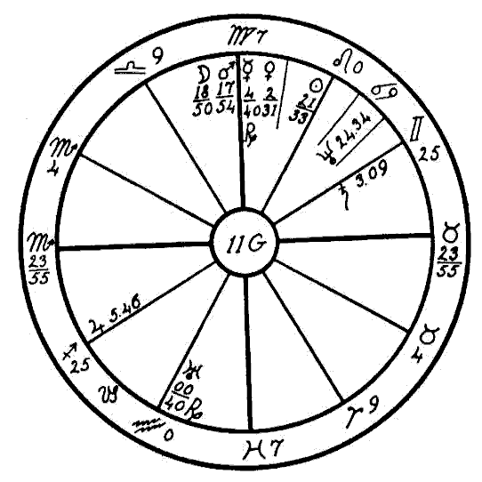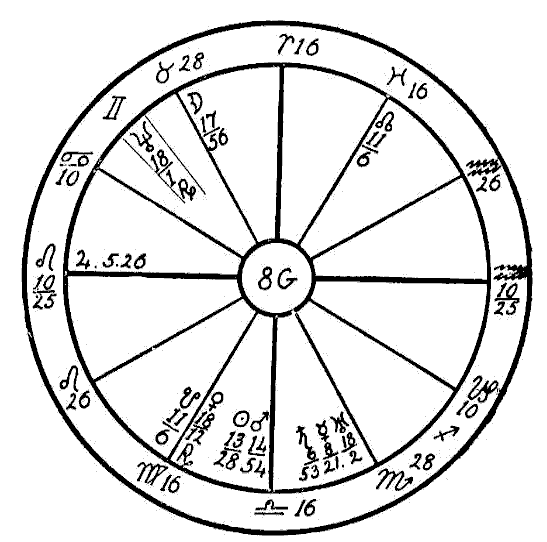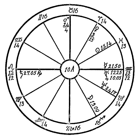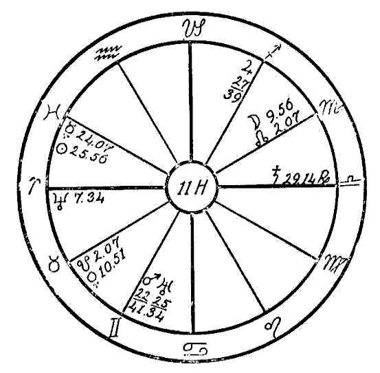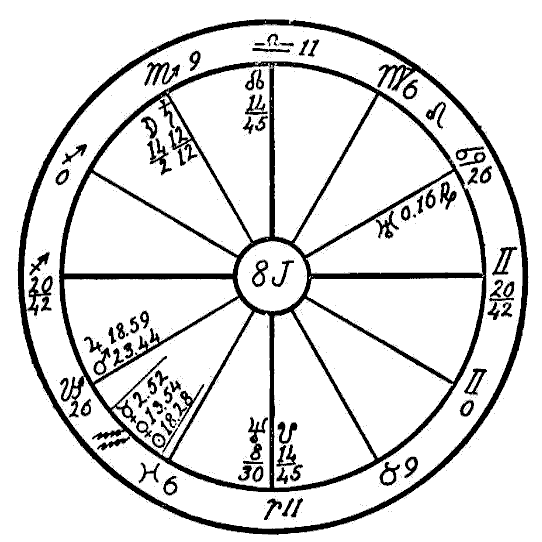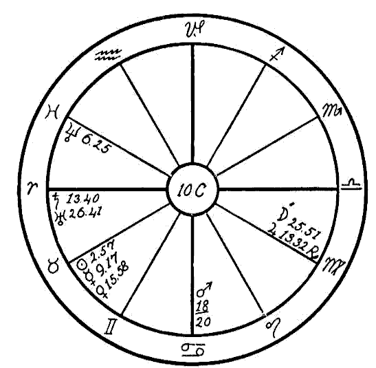 In 1914 we find the progressed Sun in the first degree of Scorpio, and the progressed Moon in the sign Aquarius forming an opposition to the Ascendant and the radical Jupiter in Leo. It is also coming up to a square of the radical Saturn, Mercury, and Uranus in Scorpio. In this same year two new Moons afflicted the three latter planets. The one on January 26th fell in five degrees of Aquarius in opposition to Jupiter and square to Saturn and Mercury. On April 25th the new Moon fell in four degrees of Taurus, square to Jupiter and opposition Saturn and Mercury. This was the time when —