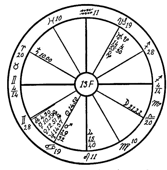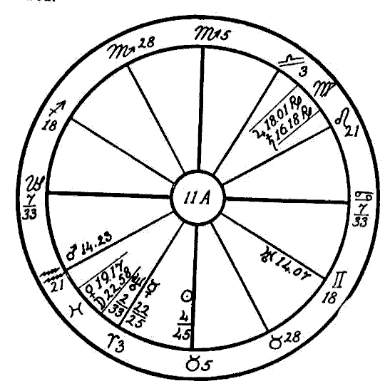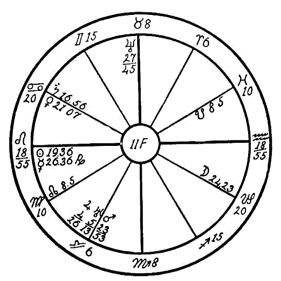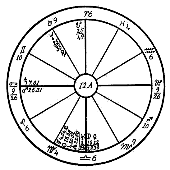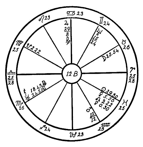 In the beginning of the year 1923 the progressed Moon was passing through the sign of Virgo and made a square to the radical Mars in Sagittarius. This disturbed the metabolism of the digestive tract, which on account of the resulting inflammation was unable to furnish the blood with the proper amount of mineral salts. This combined with the disturbed solar force caused by an afflicted Sun deprived the bones and the muscles of their —