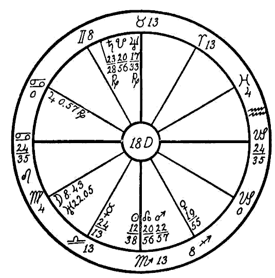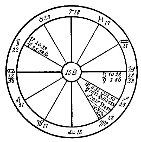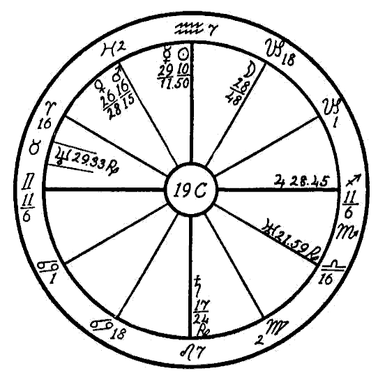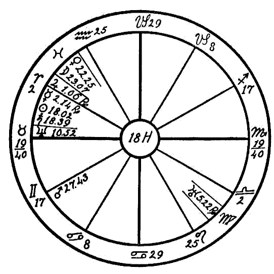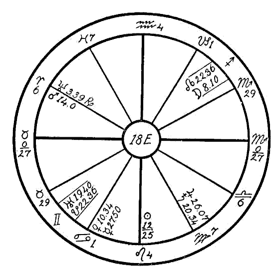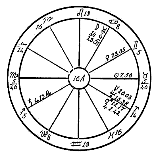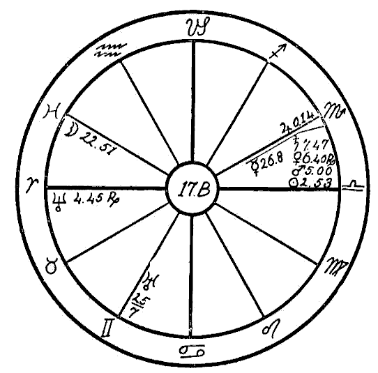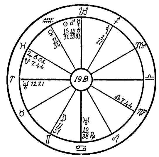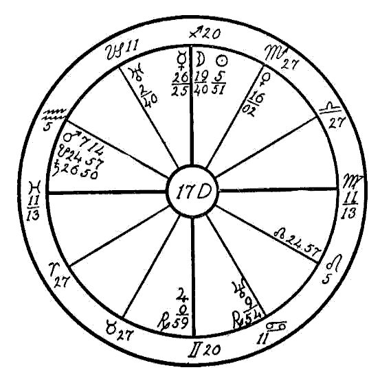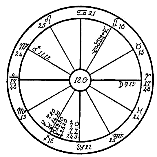 The Moon is in its own sign, Cancer, square to Jupiter. Therefore the native can expect little help from the Moon, and so we must look to the planet Mercury to see if the mind is to receive assistance to overcome the square of Neptune to Saturn. Mercury is retrograde, which makes its influence latent, and in the sign of its fall, the common and negative sign of Sagittarius. Mercury, however, while weak by sign and retrograde, is helped by a sextile of Jupiter and by one of Saturn. This will save the native from insanity.