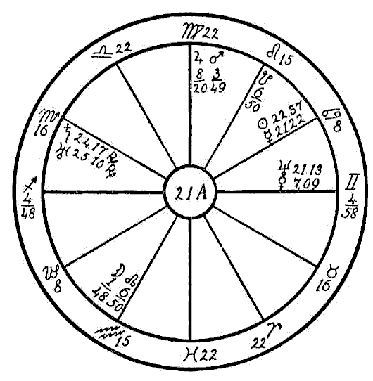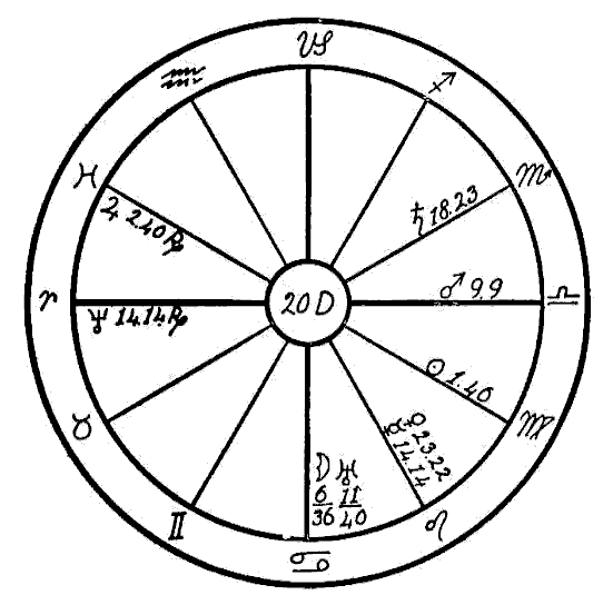 In the case of horoscope 20D, that of a man born August 25, 1867, we find Saturn in Scorpio, a fixed sign, square to Venus and Mercury in Leo, the sign ruling the heart. We again find some trouble with poor heart action; but the most disturbing affliction is found in the stomach, for the Moon and Uranus are in conjunction in the sign of Cancer, which has rule over this organ, and both are square to the inflammatory Mars, Uranus also being square to Neptune, all in cardinal signs. In this horoscope we find the seat of the trouble in the stomach, showing impulsive and unnatural habits regarding food, with a tendency to bolt the food and also excessive drinking with meals, which would cause the stomach to become distended, thereby pressing upon the heart and interfering with respiration.