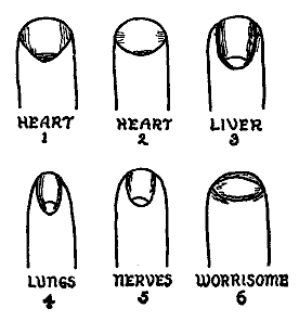 Black or blue spots on the half moons: poison in blood, obstructed circulation, or restricted heart action. The shape of the nails should be taken into consideration before making a decision; see diagrams.