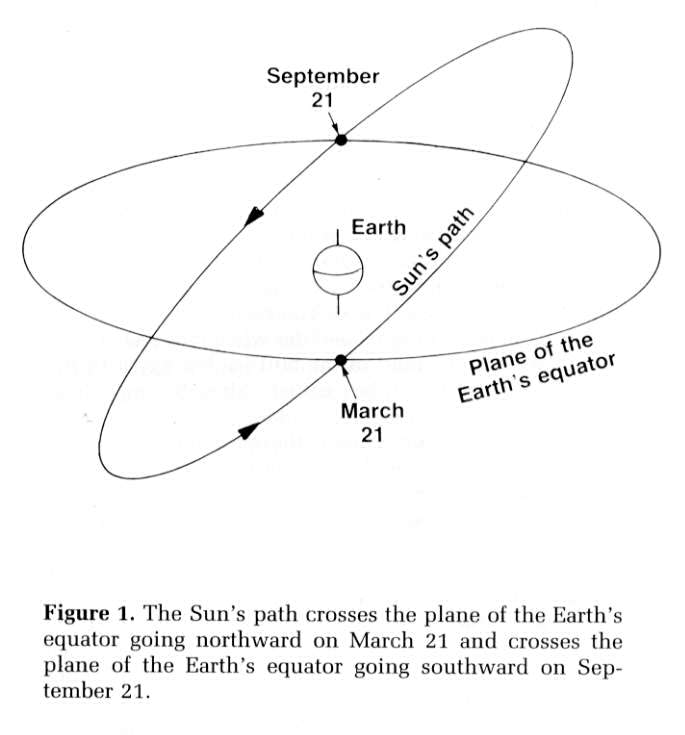 Suppose we view the solar system from a spaceship, which flies in such a way that to it the center of the Earth appears to be at rest. When viewed from the spaceship, the Sun will appear to travel approximately in a circle around the Earth. The Sun's path is tilted so that part pf it lies above the plane of the Earth's equator (see figure 1). When the Sun is on the part of its path above the equatorial plane (from March 21 to September 21), the days in the Northern Hemisphere are longer than the nights and the spring and summer seasons are experienced. When the Sun is on the part of its path below the equatorial plane (from September 21 to March 21), the days in the Northern hemisphere are shorter than the nights, and the fall and winter seasons are experienced. Life on Earth adjusts its activities to the changing seasons, using the spring and summer for procreation and growth, and using the fall and winter for harvesting and hibernating.