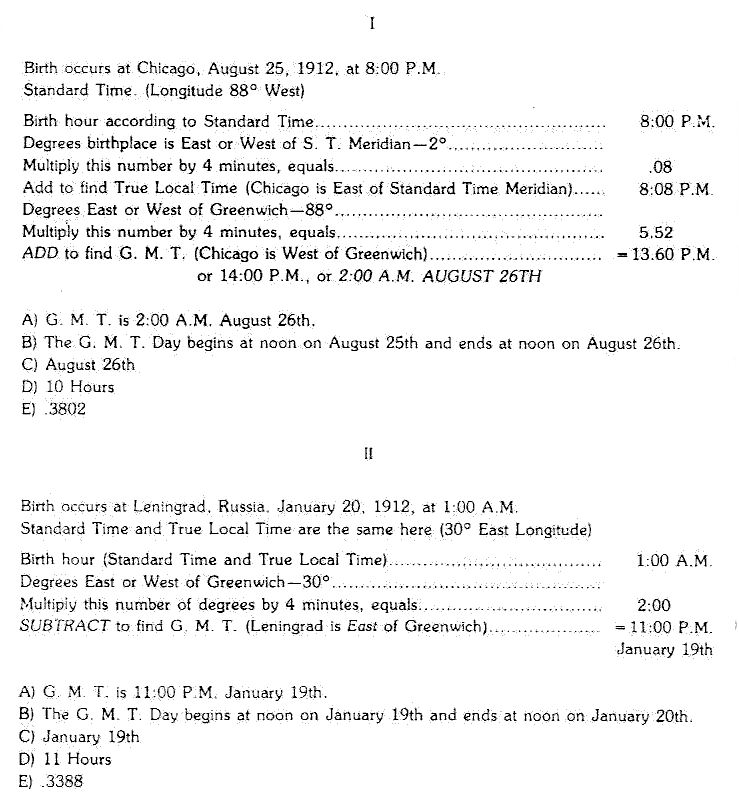 A number of students have responded that they have no ephemeris for that year, and cannot answer until they get one. That was exactly the point on which I wished to test them. No ephemeris was necessary to answer the questions. It would not have mattered had I asked: What is the Greenwich Mean Time of a birth at Chicago 1811, or 1850. All that is necessary is to add a correction of 5 hours and 52 minutes to the True Local Time of Chicago, which is 8:08 P.M., since Chicago is 2 degrees east of the Standard Time Meridian. The answer to the question is, that at the time when the clock in Chicago pointed to 8 P.M., on August 25, 1912, the clock at Greenwich showed 2 A.M., on the morning of August 26, and that is therefore the Greenwich Mean Time of birth.