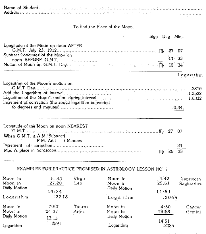 Rule No. 1 given in the last self-study module directs us to subtract the position of the planet we wish to correct on the noon preceding the G.M.T. from its place on noon after G.M.T. These are found on page 16 of the ephemeris for 1912, in the Moon column, for that is the next planet to be calculated.