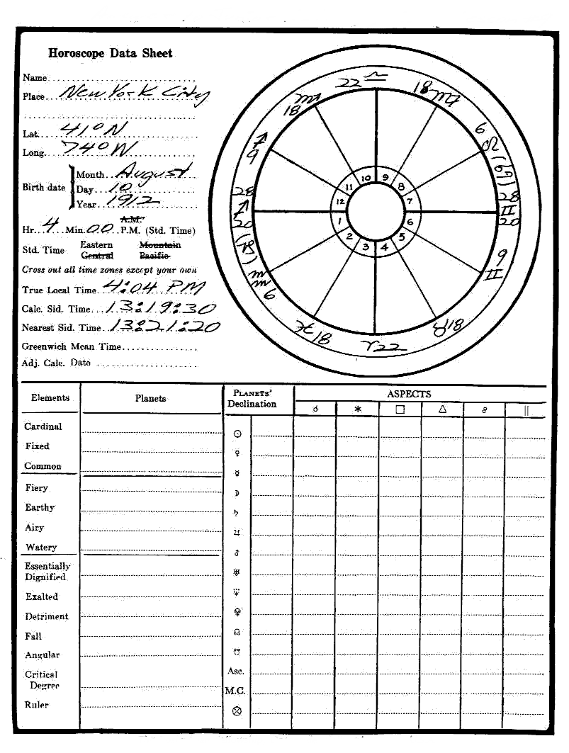 Tabulating the monthly positions of the progressed Moon for this year-period — from the fifteenth of each month — reveals that during the last two weeks of March, 1947, the progressed Moon makes the exact conjunction of his Mercury. In early June it makes the exact square of his Mars. In early August it makes the exact sextile of his Venus. (On the outside of your practice chart indicate these Moon positions. Tabulate these aspects and dates, at the bottom of the page. Bracket them so as to impress your mind with the fact that you are dealing with a "field of stimulation.")
