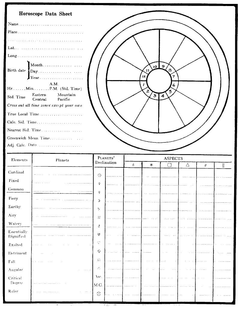 1. In Astrology Independent Study Module No. 9, I asked you to calculate the signs on the cusps of a horoscope for 4 P.M. Standard Time, August 10th, 1912, at New York. Please figure now the places of the planets, insert them in the horoscope and send it to me, that I may see if you remember how to do this work. (Please refer to "Information for Astrology Course" for help with this assignment.) (optional)