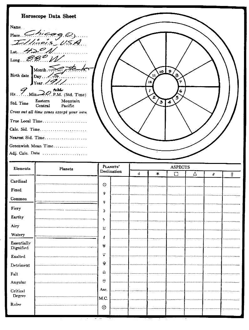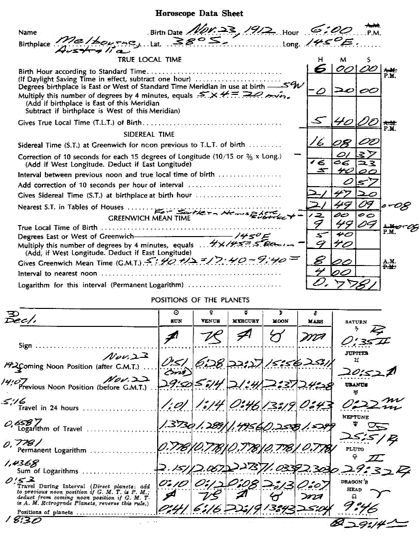 We have 26 additional Astrology Independent Study modules dealing with the esoteric and higher aspects of astrology, which we believe you would find to your advantage to pursue. On this web page you will find data sheet graphics containing the necessary information for the construction of a test horoscope. For this you will require an ephemeris for the year 1911.