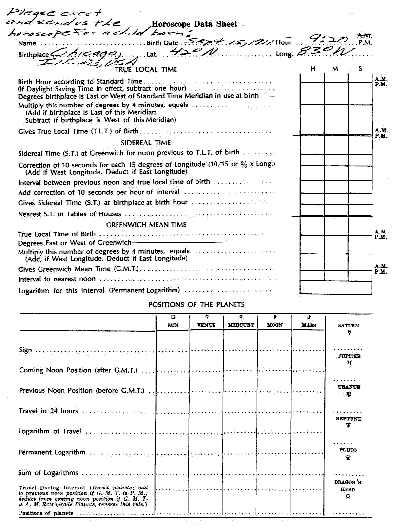 1. Please erect the horoscope for a child born September 15, 1911, 9:20 P.M., Standard Time, at Chicago, Ill., Latitude 42 N., Longitude 83 W.
