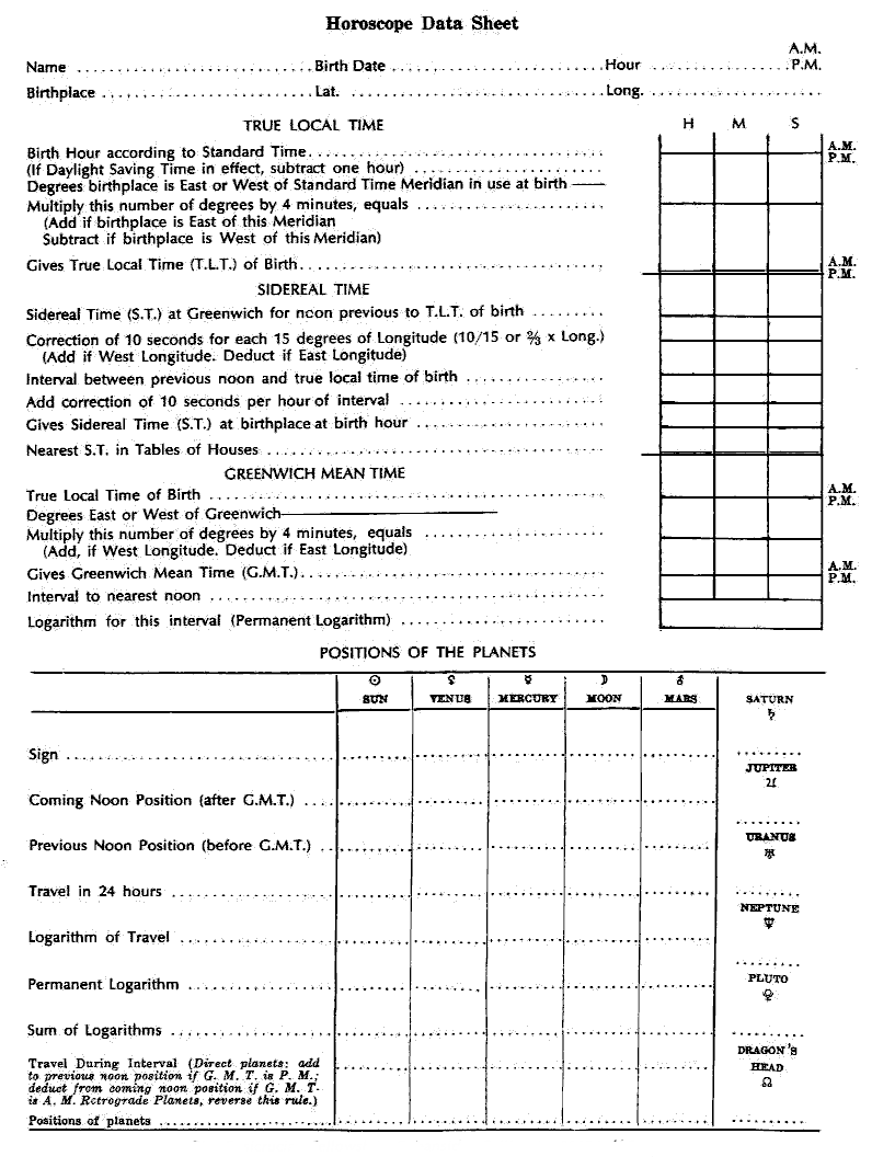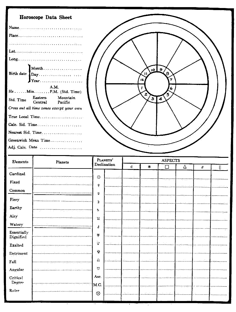 Please insert the planets in the wheel of the enclosed blank (printed version); work out the aspects, parallels, elements, etc. (Review Astrology Independent Study Module No. 20 for aspects and 22 for keywords. Also review Simplified Scientific Astrology. The ruler of the chart is described in The Message of the Stars.)